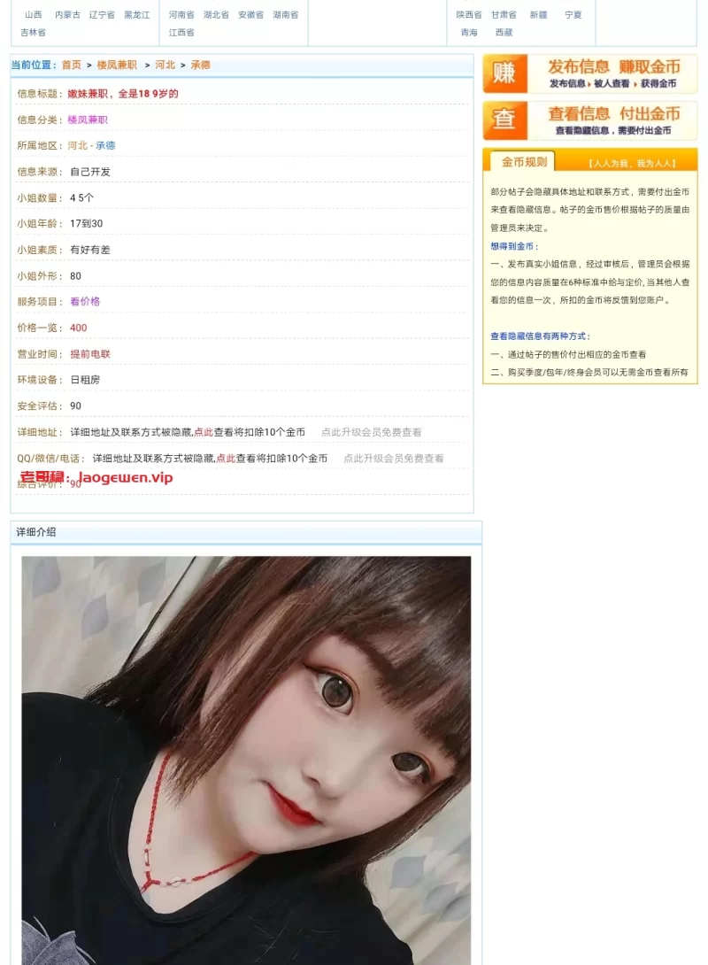 信息分类:骗子曝光 地区:河北-承德 信息来源:论坛 小姐数量:4-5 小姐年龄:17-30 小姐素质:有好有坏 小姐外形:有好有坏 服务项目:未知 价格:未知 营业时间:未知 环境设备:日租房 安全评估:0分 详细地址: (管理提示:经用户举报,此信息有诈骗行为,请勿被骗!) 联系方式: (管理提示:经用户举报,此信息有诈骗行为,请勿被骗!) 综合评价:0分 详细介绍: 联系方式shenhaiairen9383根本不能用,坑害金币。 骗子曝光