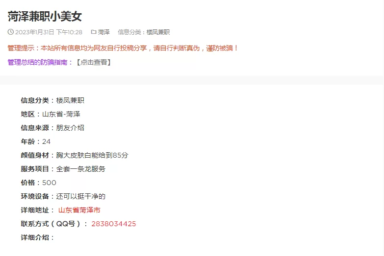 信息分类:骗子曝光 地区:山东省-菏泽 信息来源: 论坛 年龄:24 颜值身材:胸大皮肤白能给到85分 服务项目:全套一条龙服务 价格:500 环境设备:还可以挺干净的 详细地址: (管理提示:经用户举报,此信息有诈骗行为,请勿被骗!) 联系方式(QQ号): (管理提示:经用户举报,此信息有诈骗行为,请勿被骗!) 详细介绍: 骗子,卖信息的,还要再次收费 骗子曝光